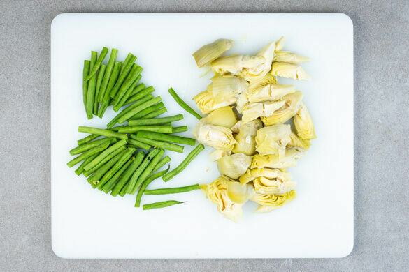 In einem mittelgroßen Topf ausreichend gesalzenes Wasser für die Pasta und die Bohnen zum Kochen bringen. Die Artischocken in ein Sieb abgießen und abtropfen lassen. Die Enden der Bohnen abschneiden, dann die Bohnen quer halbieren.