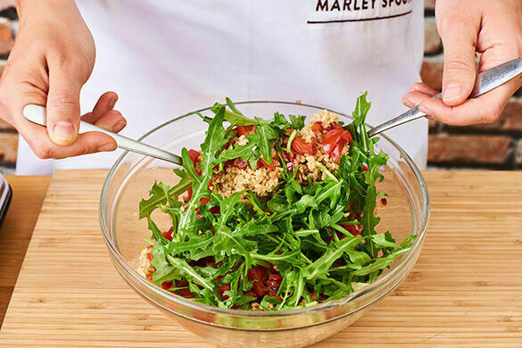Den Bulgur mit den Kirschtomaten, dem Paprika-Zwiebel-Gemüse und dem Rucola vermengen und den Salat mit 1–2TL Zitronenschale, 1–2EL Zitronensaft, 2EL Olivenöl sowie Salz und Pfeffer abschmecken. Das Fleisch in Tranchen schneiden, auf dem Bulgursalat anrichten und mit den Zitronenspalten servieren.