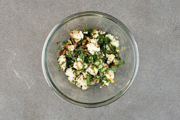 Die Basilikumblätter von den Stängeln zupfen und fein schneiden. Die Basilikumstängel aufbewahren. Die Rauchmandeln grob hacken. Die ½ des Fetas mit den Fingern oder einer Gabel zerkrümeln und mit dem Basilikum, den Mandeln, 2EL Olivenöl und je 1 kräftigen Prise Salz und Pfeffer vermengen.