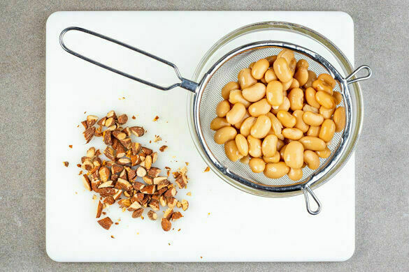 Die Bohnen in einem Sieb mit kaltem Wasser abspülen und abtropfen lassen. Die Rauchmandeln grob hacken.