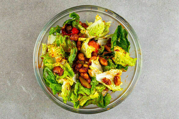 Den Romanasalat in grobe Streifen zupfen, dabei den harten Strunk entfernen. Die Romanablätter mit den Bohnen, dem Sellerie und der Paprika vermengen und den Salat auf Teller verteilen. Nach Geschmack mit etwas Olivenöl beträufeln und das Fleisch darauf anrichten. Mit den Rauchmandeln garnieren und servieren.