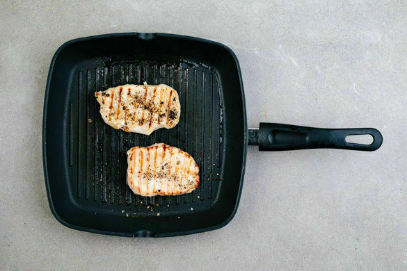 Eine Grillpfanne stark erhitzen. Das Fleisch trocken tupfen, mit 2TL Olivenöl rundum einreiben und von beiden Seiten mit je 1 Prise Salz und Pfeffer würzen. In der heißen Grillpfanne auf jeder Seite 2–3Min. anbraten. Tipp: Wer keine Grillpfanne hat, kann auch die Gemüsepfanne benutzen. Das Fleisch mit den Ofenkartoffeln und dem Ajvar-Dip anrichten und servieren.
