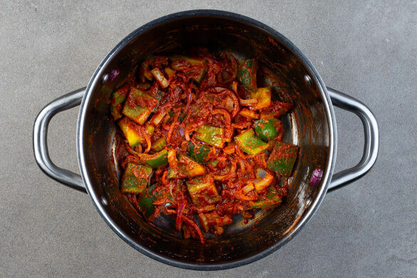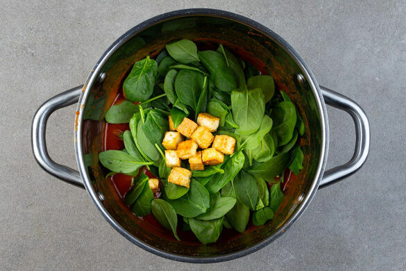 Den Tofu und den Spinat unter das Ragout heben und das Ragout weitere 4–6Min. ohne Deckel köcheln lassen.