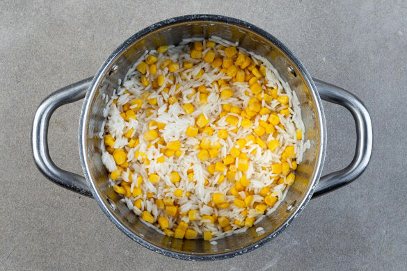 Inzwischen den Reis und die 1/2 des Maises in einem Sieb kalt abspülen, bis das Wasser klar bleibt. Der übrige Mais wird für dieses Rezept nicht benötigt. Den Reis und den Mais in das kochende Wasser geben und abgedeckt bei niedrigster Hitze 10–12Min. kochen, bis das Wasser aufgesogen und der Reis gar ist. Noch ca. 5Min. ohne Hitzezufuhr ziehen lassen.
