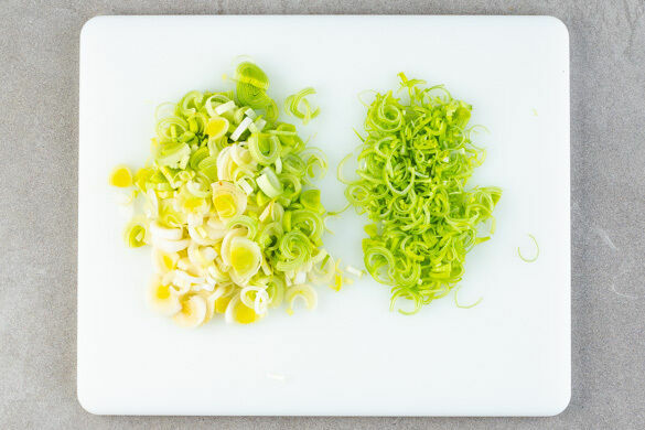 Den Backofen auf 220°C (200°C Umluft) vorheizen. In einem Wasserkocher 1,2L Wasser aufkochen. 4EL Butter aus dem Kühlschrank nehmen und weich werden lassen. Den Lauch längs halbieren, den grünen und weißen Teil getrennt in feine Streifen schneiden. Den Blumenkohl in ca. 2cm große Stücke schneiden.