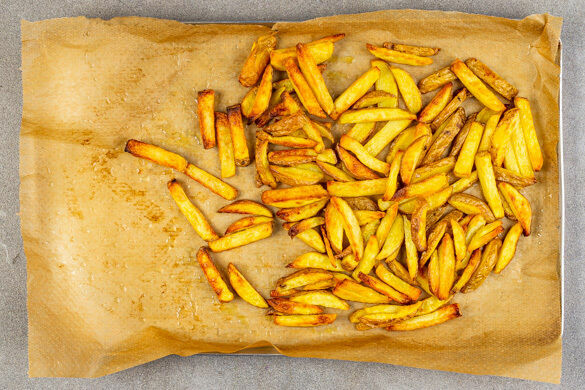 Den Backofen auf 230°C (210°C Umluft) vorheizen. Die Kartoffeln samt Schale in ca. 1cm dünne Stifte schneiden. Auf einem mit Backpapier ausgelegten Backblech mit 2EL Pflanzenöl sowie 1/2TL Salz und 1 kräftigen Prise Pfeffer vermengen und im Ofen 25–30Min. backen, bis die Pommes goldbraun und gar sind.