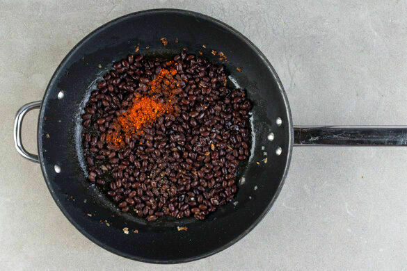 Die Zwiebeln in einer großen Pfanne mit 2EL Olivenöl bei mittlerer Hitze ca. 2Min. goldgelb anbraten. Die Bohnen, die Gewürzmischung und je ½TL Salz und Pfeffer unterrühren und ca. 1Min. mitbraten. Die Pfanne vom Herd nehmen, die Bohnen ggf. erneut mit Salz und Pfeffer abschmecken und abkühlen lassen. Die Pfanne auswischen.