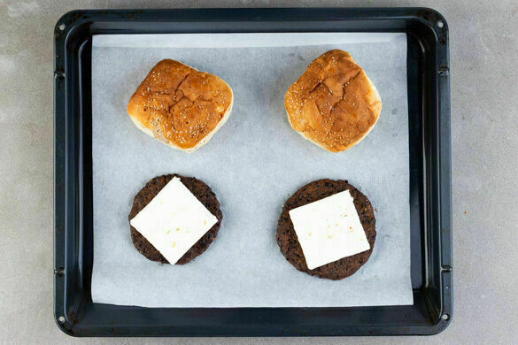 Den Feta jeweils horizontal halbieren und auf die Pattys legen. Die Brötchen danebenlegen und alles ca. 5Min. im Ofen backen, bis der Käse leicht angeschmolzen ist und die Brötchen knusprig sind. Die Burger nach Belieben mit 2EL Mayonnaise, dem Chutneydip, den Pattys, den Gurkenscheiben und dem restlichen Rucola belegen und mit dem Salat servieren.