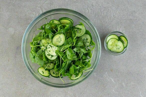 Die Gurke in dünne Scheiben schneiden. Den Schnittlauch in kleine Röllchen schneiden. Einige Gurkenscheiben für den Burger beiseitelegen, die restlichen Gurken mit dem Schnittlauch, der ½ des Rucola, 2EL Olivenöl, 4EL hellem Essig sowie je 1 kräftigen Prise Zucker, Salz und Pfeffer vermengen.