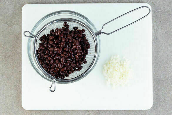 Den Backofen auf 220°C (200°C Umluft) vorheizen. Die Bohnen in einem Sieb abtropfen lassen. Die Zwiebel schälen, halbieren und fein würfeln.