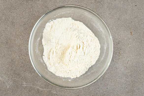120g Mehl mit 2TL Backpulver und 1 kräftigen Prise Salz vermengen.