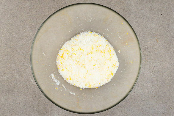 Die Zitronenschale abreiben, dann die Zitrone halbieren und auspressen. 120g Zucker mit dem Vanillezucker und der Zitronenschale ca. 1Min. verrühren, bis der Zucker feucht aussieht und nach Zitrone riecht.
