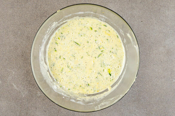 Den Blaumohn, die Eier, 1EL Zitronensaft und 100ml Pflanzenöl in die Zucker-Mischung geben und mit einem Handrührgerät 2–3Min. rühren, bis der Teig hell und schaumig wird. Anschließend die Zucchiniraspel einrühren, dann die Mehl-Mischung vorsichtig unterheben.