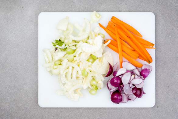 Den Backofen auf 220°C (200°C Umluft) vorheizen. Die Karotten ggf. schälen und je nach Dicke längs halbieren oder vierteln. Den Fenchel längs halbieren, den Strunk entfernen und den Fenchel in 0,5–1cm dünne Scheiben schneiden. Die Zwiebel schälen und halbieren, eine Hälfte beiseitelegen, die andere Hälfte in Spalten schneiden und die einzelnen Schichten voneinander trennen.