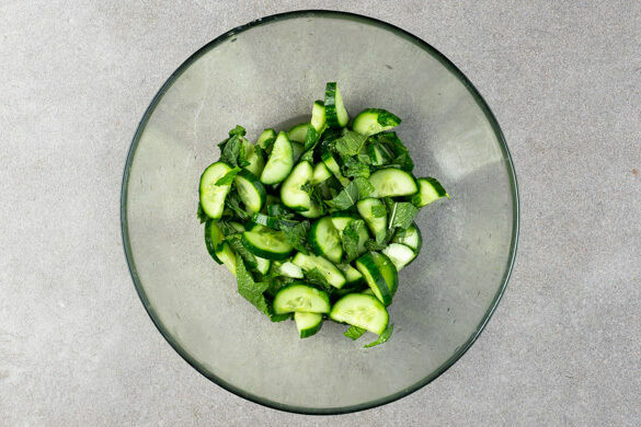 Die Gurke längs halbieren und in dünne Scheiben schneiden. Die Minzeblätter von den Stängeln zupfen und grob schneiden. 2EL hellen Essig, ½EL Zucker und 1 kräftige Prise Salz verrühren, bis Zucker und Salz sich aufgelöst haben, dann mit den Gurken und der Minze vermengen und beiseitestellen.