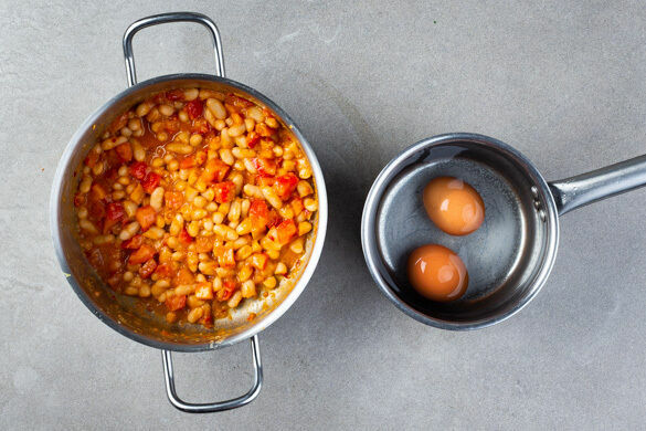 In einem kleinen Topf ausreichend Wasser für die Eier zum Kochen bringen. Die Tomaten in ca. 1cm große Würfel schneiden. Die Knoblauch-Ingwer-Paste in einem mittelgroßen Topf mit 1EL Olivenöl bei mittlerer Hitze 1–2Min. erwärmen. Die Bohnen in ein Sieb abgießen und abtropfen lassen.