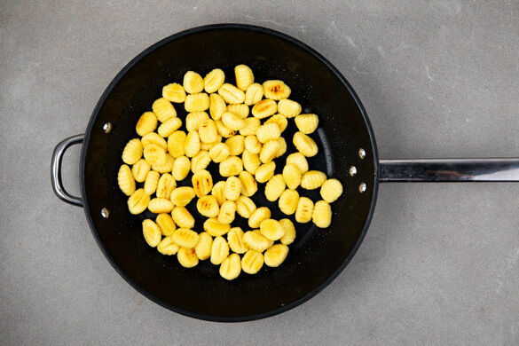 Parallel in einer zweiten großen Pfanne die Gnocchi mit 1EL Olivenöl bei mittlerer bis starker Hitze in 6–7Min. goldbraun und knusprig anbraten. Den Käse fein reiben.