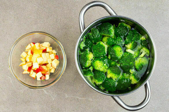 In einem großen Topf ausreichend gesalzenes Wasser für den Brokkoli zum Kochen bringen. Den Brokkoli in mundgerechte Röschen schneiden, den Strunk ebenfalls klein schneiden, ggf. vorher schälen. Den Brokkoli 4–6Min. kochen, bis er gar, aber noch bissfest ist. Inzwischen die Äpfel vierteln, entkernen und in kleine Würfel schneiden.