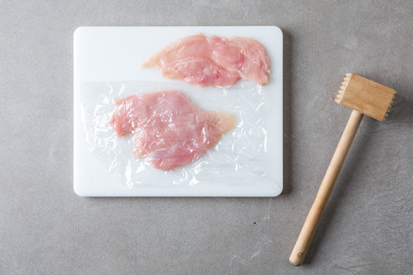 Den Backofen auf 220°C Umluft oder 240°C Ober-/Unterhitze vorheizen. Die Hähnchenbrust längs halbieren und mit einer schweren Pfanne oder einem Fleischklopfer zwischen zwei Lagen Klarsichtfolie ca. 1cm dünn klopfen.