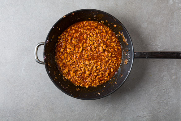 Das Hackfleisch mit den Zwiebeln in einer großen Pfanne in 1-2EL Olivenöl ca. 2-3Min. scharf anbraten, dann Knoblauch und Tomatenmark unterrühren. Nun mit 300-350ml Wasser ablöschen und Brühwürfel reinbröseln. Alles ca. 5-7Min. auf mittlerer Hitze köcheln lassen und mit Salz und Pfeffer abschmecken. Tipp: Mit 1-2EL Balsamicoessig abschmecken.