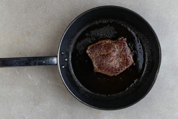 Das Fleisch trocken tupfen, mit Salz und Pfeffer würzen und in einer großen Pfanne mit 2EL Pflanzenöl bei starker Hitze auf der Fettseite 2–4Min. scharf anbraten. Wenden und weitere 2–4Min. braten, je nach Dicke des Fleisches. Die Hitze reduzieren und das Fleisch 1–3Min. abgedeckt garen, je nachdem, ob es medium oder durch sein soll. Abgedeckt auf einem Teller ruhen lassen.