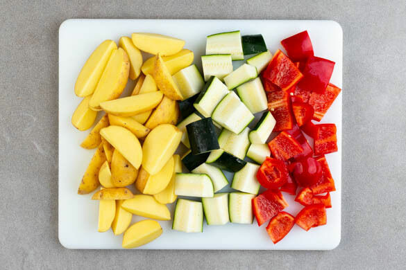 Den Backofen auf 220°C (200°C Umluft) vorheizen. Die Kartoffeln samt Schale in ca. 2cm breite Spalten schneiden. Die Zucchini längs vierteln, dann in 2–3cm große Stücke schneiden. Die Paprika ebenfalls in 2–3cm große Stücke schneiden.