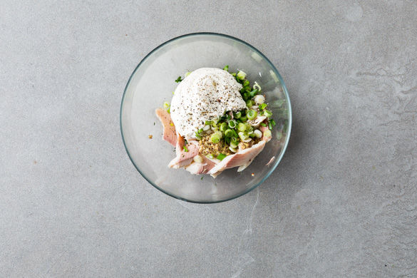 Die Forelle mit Crème fraîche, Lauchzwiebeln und Senf vermengen und mit Salz und Pfeffer abschmecken.