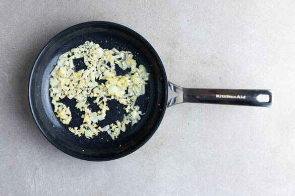 Den Backofen auf 240°C (220°C Umluft) vorheizen. Den Knoblauch schälen und sehr fein würfeln oder durch eine Knoblauchpresse drücken. Die Zwiebel schälen, halbieren und grob würfeln. Die Zwiebeln und die ½ des Knoblauchs in einer großen Pfanne mit 2EL Butter bei mittlerer Hitze 5–7Min. anschwitzen.