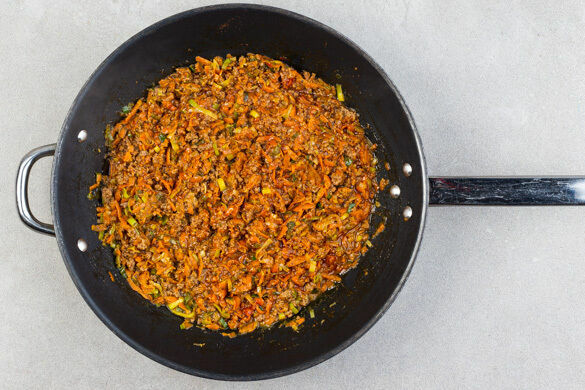 Den Knoblauch dazugeben, das Gemüse mit dem Paprikapulver und dem Oregano bestäuben und ca. 1Min. mitbraten. Dann das Hackfleisch in die Pfanne geben und ca. 4Min. krümelig anbraten. Mit der Sojasauce sowie Salz und Pfeffer würzen.