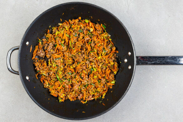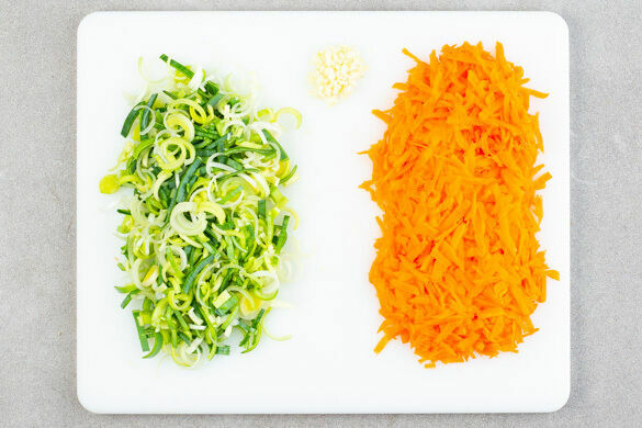 Den Backofen auf 220°C (200°C Umluft) vorheizen. Die Karotten ggf. schälen und mit einer Küchenreibe grob raspeln. Den Lauch halbieren und in feine Streifen schneiden. Den Knoblauch schälen und fein würfeln oder durch eine Knoblauchpresse drücken.