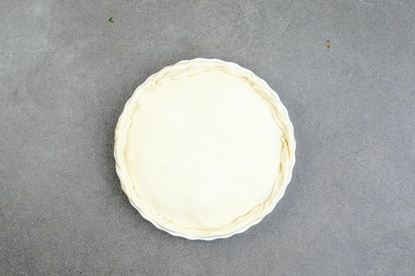 Die Hackfleischmasse in eine nicht zu große, runde Auflaufform geben und ca. 3/4 des Käses darüber verteilen. Den Blätterteig ausrollen und die Füllung damit bedecken. Überstehende Ränder abschneiden, nach Geschmack Dekorationselemente daraus formen und auf dem Teig verteilen. Tipp: Wer mag, kann 1 Ei verquirlen und auf der Teigdecke verstreichen.