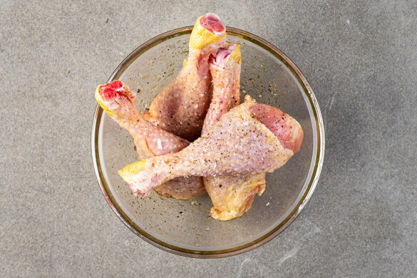 Den Backofen auf 240°C (220°C Umluft) vorheizen. Die Drumsticks trocken tupfen mit 2EL Pflanzenöl, ½TL Salz und 1 kräftigen Prise Pfeffer rundum einreiben.