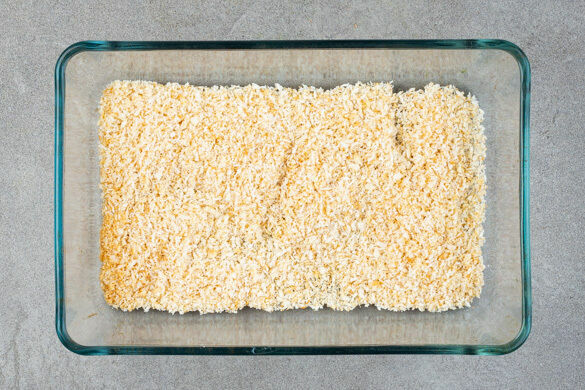 Die ½ des Panko-Paniermehls auf einem mit Backpapier ausgelegten Backblech verteilen und 2–3Min. im Ofen rösten. Vorsicht, es kann schnell zu dunkel werden. Das Panko-Paniermehl aus dem Ofen nehmen und auf einem tiefen Teller mit den Kokosraspeln vermengen.
