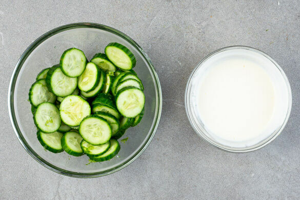 Die ½ des Limettensafts mit 3EL Mayonnaise verrühren. Die Gurke in Scheiben schneiden, dann mit dem restlichen Limettensaft, der Limettenschale und 1 kräftigen Prise Salz vermengen. Den Fisch und das Gemüse mit dem Gurkensalat auf Tellern anrichten und mit dem Limettendip servieren.