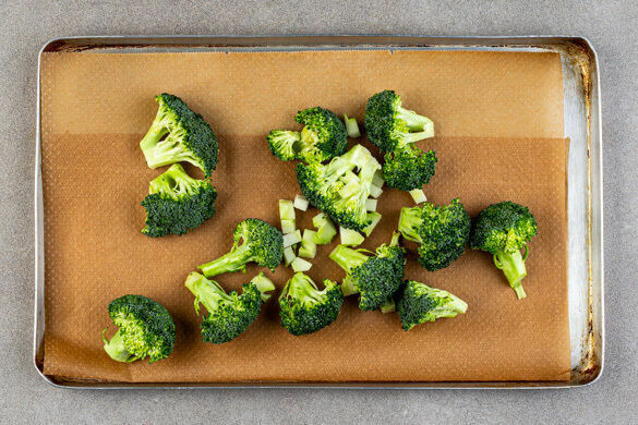 Den Backofen auf 240°C (220°C Umluft) vorheizen. Den Brokkoli in ca. 4cm große Röschen und den Strunk in ca. 1,5cm große Würfel schneiden. Die Röschen und den Strunk mit 2EL Olivenöl und ½TL Salz vermengen und auf einem mit Backpapier ausgelegten Backblech verteilen. Den Brokkoli 12–18Min. im Ofen rösten, bis er leicht gebräunt ist.