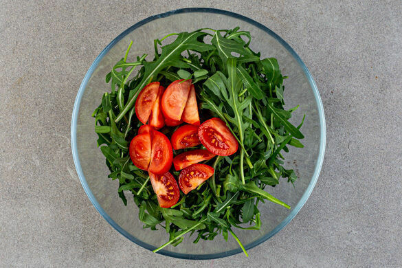 Die Tomaten in ca. 1cm breite Spalten schneiden, dann mit dem Rucola und dem Dressing vermengen.