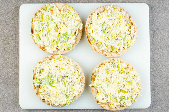 Den Lauch vom Herd nehmen und mit 1 kräftigen Prise Pfeffer würzen. Die Crème fraîche und den Käse unterrühren und den Käse-Lauch-Mix gleichmäßig auf 8 Pitas verteilen. Den Brokkoli und den Speck darauf anrichten.
