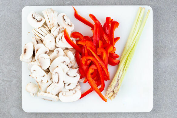 Die Pilze ggf. säubern und in dünne Scheiben schneiden. Die Paprika vierteln, entkernen und in dünne Streifen schneiden. Das Zitronengras längs halbieren und mit einer breiten Messerklinge flach drücken. Die 1/2 des Ingwers schälen und fein reiben oder sehr fein würfeln. Tipp: Wer mag, kann auch mehr Ingwer verwenden.