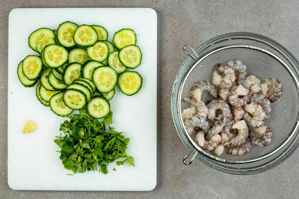 Die Gurke in dünne Scheiben schneiden. Den Koriander samt Stängeln grob schneiden. Den Knoblauch schälen und fein würfeln. Die Garnelen in einem Sieb kalt abspülen und abtropfen lassen.