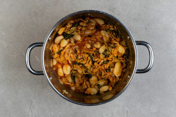 Das Tomatenmark einrühren und ca. 1Min. erhitzen. Die Bohnen in einem Sieb mit kaltem Wasser abspülen, abtropfen lassen und in den Topf geben. 700–800ml heißes Wasser angießen und das Brühgewürz einrühren. Den Wirsing abgedeckt bei mittlerer bis starker Hitze 12–15Min. köcheln lassen. Mit Salz und Pfeffer abschmecken.