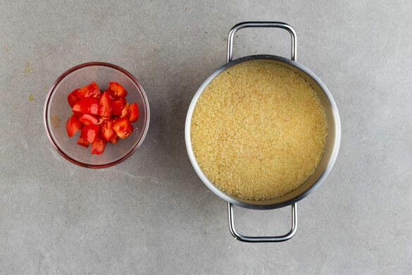 In einem mittelgroßen Topf 600ml Wasser zum Kochen bringen. Den Topf vom Herd nehmen, den Couscous und die ½ des Brühgewürzes in das kochende Wasser rühren und abgedeckt 6–8Min. quellen lassen. Die Tomaten in ca. 1cm große Würfel schneiden.
