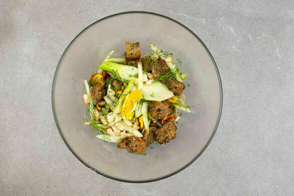 Heute auf dem Tisch: ein herzerwärmend leckerer Salat mit weißen Bohnen, knusprigen Brotstückchen mit Sumachnote, würzigem Fenchel, einem frischen Orangendressing und viel, viel Dill. Ideal, wenn es nahrhaft und leicht zugleich sein darf! Star der bunten Show: die ofengeröstete gelbe Bete, die durch ihre feine geschmackliche Mischung aus frisch und süß glänzt. Vielleicht ein neues Lieblingsessen?