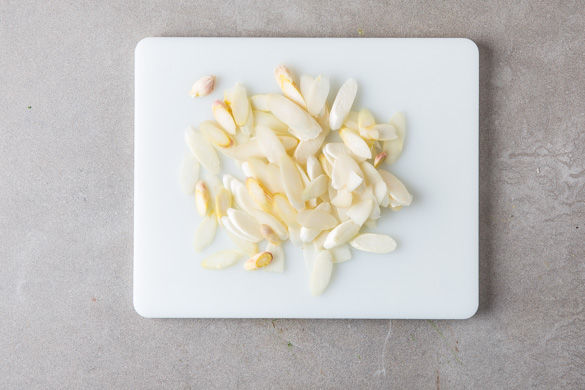 Den Backofen auf 200°C Umluft oder 220°C Ober-/Unterhitze vorheizen. Die hölzernen Enden des Spargels ca. 1-2cm lang abschneiden, die Stangen dann mit einem Sparschäler vom Kopf zum Stiel hin schälen und in schräge, dünne Scheiben schneiden.