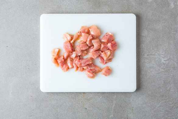 Die Hähnchenbrust trocken tupfen und in ca. 1-2cm große Stücke schneiden, mit Salz und Pfeffer würzen.