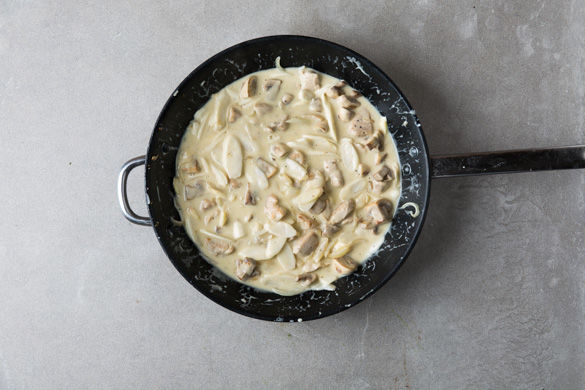 In einer großen Pfanne 1-2EL Olivenöl erhitzen und die Hähnchenwürfel darin ca. 2-3Min. anbraten, bis das Fleisch nicht mehr rosa ist. Dann die Zwiebel und die Pilze hinzugeben und weitere 2 -3Min. braten, bis das Gemüse weich wird.