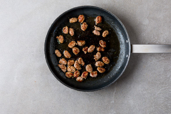 Inzwischen die Salsiccia von der Pelle befreien und in feine Scheiben schneiden. In einer mittelgroßen Pfanne ca. 2-3Min. kross anbraten und mit Spargel und Basilikum auf dem Risotto servieren.