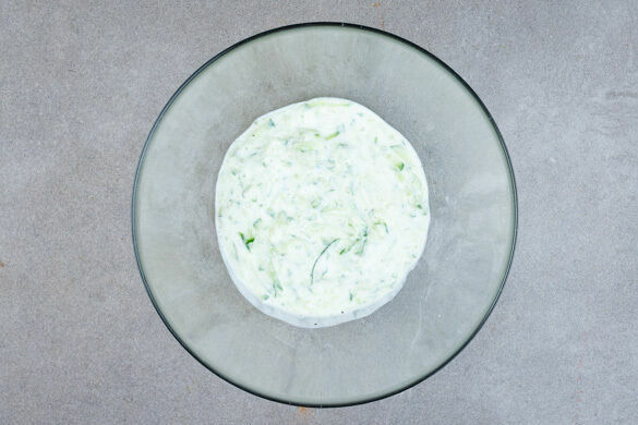 Den Knoblauch schälen und sehr fein würfeln oder durch eine Knoblauchpresse drücken. Die Gurke grob reiben und mit dem Joghurt und dem Knoblauch vermengen. Den Gurkenjoghurt mit Salz und Pfeffer abschmecken.
