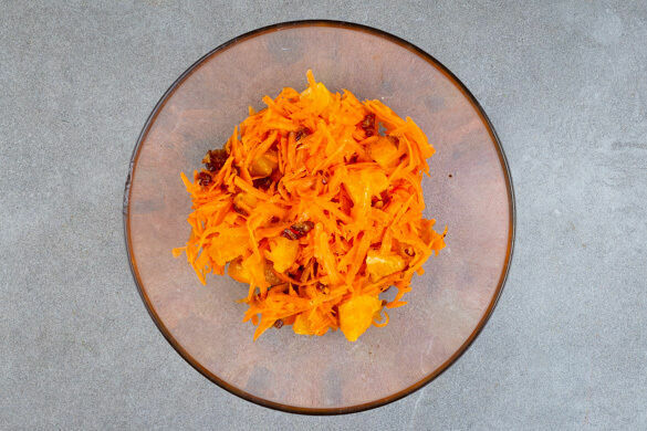 Die Karotte ggf. schälen und grob raspeln. Die Orange komplett schälen und in ca. 1cm große Würfel schneiden, austretenden Saft auffangen. Die Chilischote halbieren, entkernen und in feine Streifen schneiden. Die Karotten mit der Orange samt Saft, den Datteln, 2EL hellem Essig und 1EL Olivenöl vermengen. Mit Chili nach Geschmack sowie Salz und Pfeffer würzen.