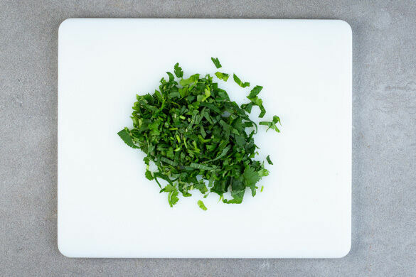 Die Minzeblätter abzupfen. Die Minzeblätter und den Koriander samt Stängeln fein schneiden.