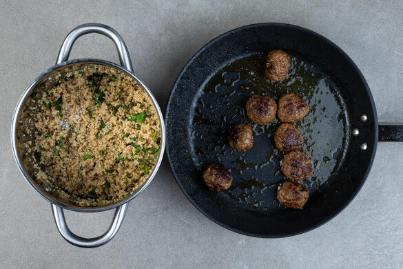Die Fleischbällchen in einer mittelgroßen Pfanne mit 1EL Olivenöl bei mittlerer Hitze 4–6Min. rundum appetitlich braun braten. Die Quinoa mit der 1/2 der Kräuter vermengen und mit Salz und Pfeffer abschmecken. Die Fleischbällchen mit der Quinoa, dem Salat und dem Gurkenjoghurt anrichten und mit den restlichen Kräutern garniert servieren.